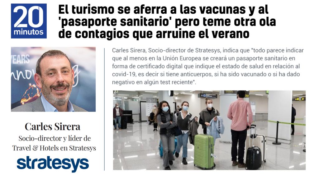 El diario de información general 20 Minutos ha consultado a expertos de diversas áreas sobre cómo auguran el futuro inmediato del sector turístico en España. Entre los consultados, Carles Sirera, socio-director de Stratesys y líder de la industria Travel & Hotels, ha aportado su visión al respecto, inclinándose hacia la posibilidad de la creación, por parte de la Unión Europea, de un certificado digital que indique el estado de salud en relación con el covid-19, de cara a remitir los efectos de posibles rebrotes